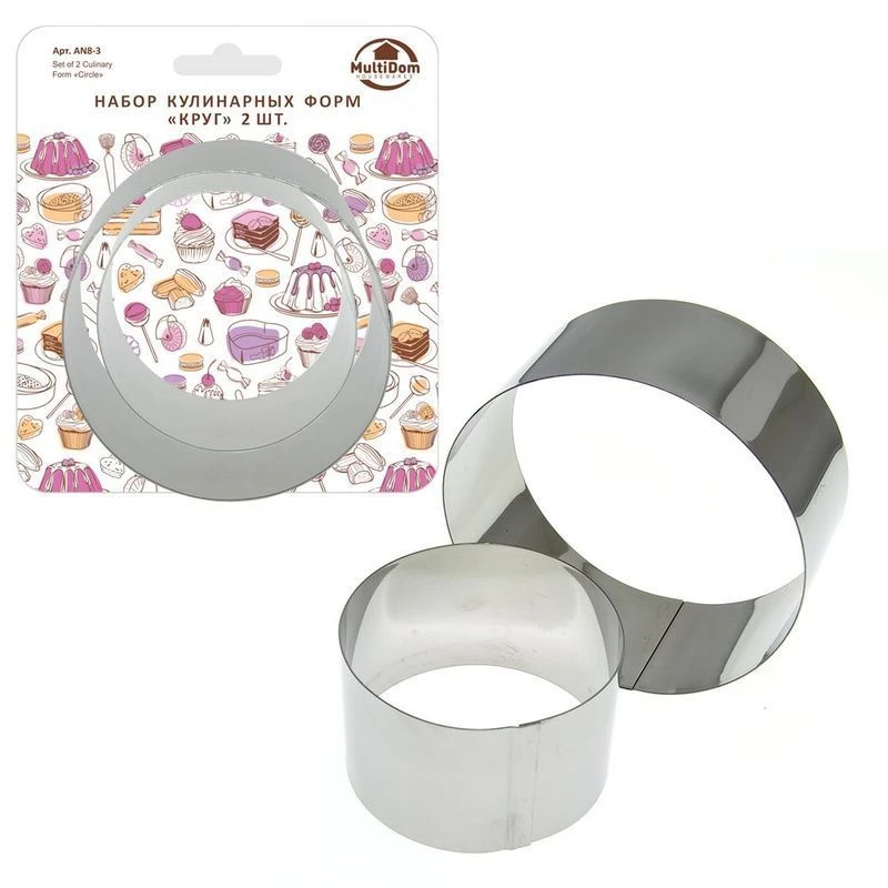 Набор кулинарных форм – полезный инструмент на любой современной кухне. В наборе 2 формы с диаметрами 7 и 10 см, высотой 4,5 см. Инструмент подходит для приготовления слоеных блюд, выкладки салатов, сборки оригинальных бутербродов, для жарки омлетов и создания креативных десертов.
