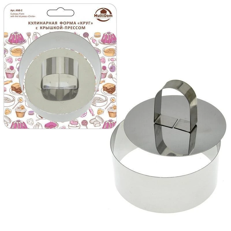 Диаметр 10 см, высота 4 см, в комплекте крышка, которая помогает придать форму продуктам. Изделие производится из нержавеющей стали. Рекомендуется после каждого использования промывать форму в проточной воде с жидкими моющими средствами.