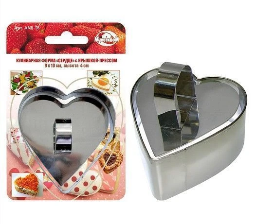 Для приготовления необычных десертов или выкладки салатов используйте кулинарную форму «Сердце». Изделие предназначено для оригинального оформления слоеных блюд, в том числе, салатов, для сборки бутербродов, жарки омлетов и яичницы. Такая форма подойдет для приготовления праздничных блюд, вы точно удивите своих гостей креативной подачей. Приспособление всегда будет кстати и в повседневном использовании — готовьте детям бутерброды-сердечки, им обязательно понравится. Любителям пирожных эта форма точно понадобится, ведь с ее помощью можно вырезать бисквит и собрать настоящее кондитерское изделие. Размер 9х10х4 см, в комплект входит крышка, с которой удобно формировать продукты и выталкивать готовое блюдо. Приспособление изготовлено из коррозионностойкой (нержавеющей) стали. После применения промывается губкой с жидкими моющими средствами. Храните изделие в сухом помещении.