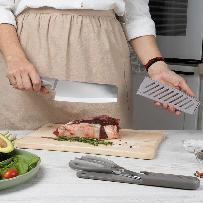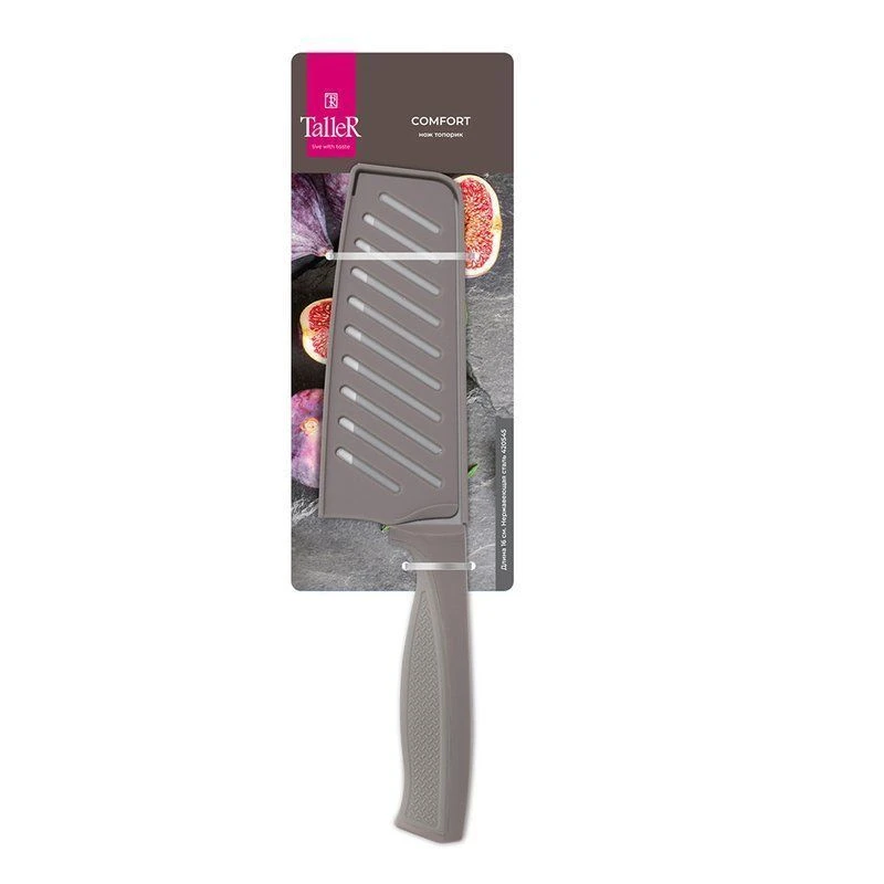 Подходит для разделки крупных кусков мяса или рыбы. Длина лезвия - 16 см, ширина лезвия - 6 см, толщина лезвия - 1,8 мм. Лезвие ножа сделано из высококачественной коррозионностойкой стали AISI 420S45 (3Cr13). Рукоять выполнена из ударопрочного пластика с силиконовой вставкой для удобства хвата и предотвращения выскальзывания. Цвет рукояти - коричневый, силиконовой вставки - светло-коричневый (бежевый). В комплекте с ножом идет чехол из твердого безопасного пластика (PP). Цвет чехла сочетается с цветом рукояти. Благодаря чехлу нож можно безопасно хранить, а также удобно взять в поход, на пикник, дачу и др. Вес ножа - 167 г, с чехлом - 195 г.