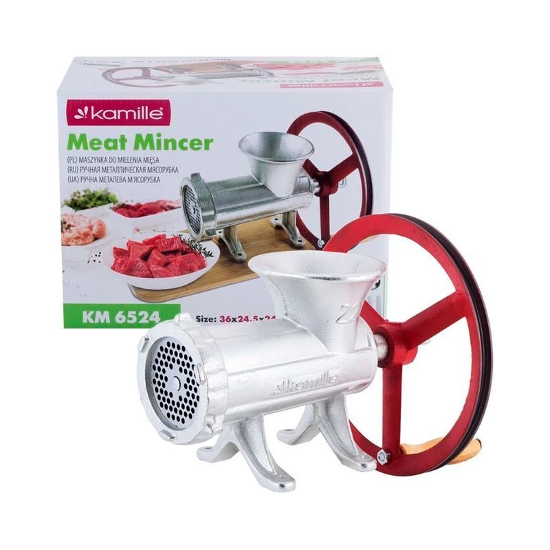 Комплектация: мясорубка, нож, внутренние насадки-решетки 4 шт. (O8,3 см). внешние насадки-воронки (O2,5, O2, O1,5), ведущие колёса (O24,5; O6), ручка (12,5 см)