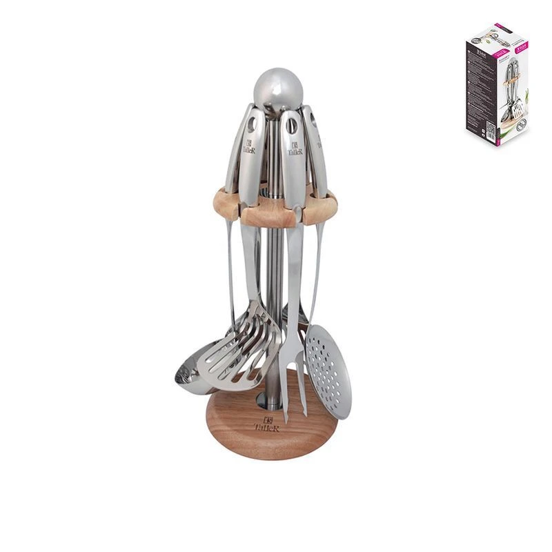 В наборе: половник, ложка поварская, шумовка, вилка поварская, картофелемялка, лопатка.