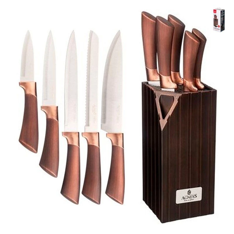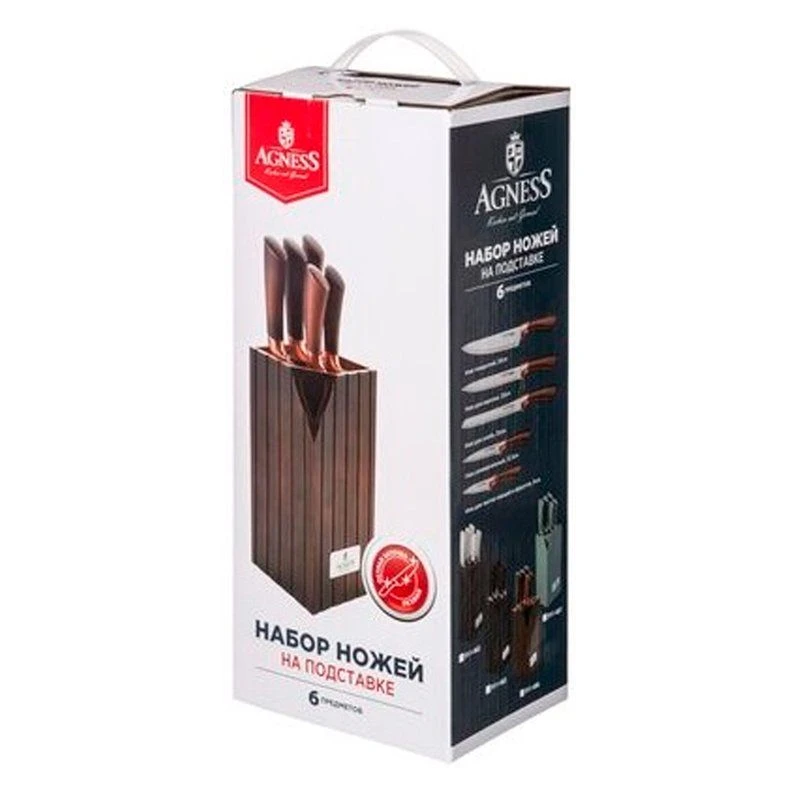 Состав набора: Нож поварской 20см, Нож для хлеба 20см, Нож для нарезки 20см, Нож универсальный 12,5см, Нож для чистки овощей и фруктов, 9см, Пластиковая подставка