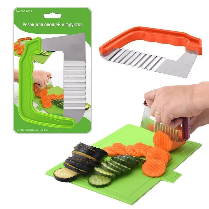 С помощью резака для овощей и фруктов, Вы сможете украсить Ваш праздничный стол красиво нарезанными овощами и фруктами. Он станет Вашим незаменимым помощником при нарезке не только овощей и фруктов, но и сыра. Удобная ручка позволит Вам порезать большое количество овощей, не прилагая особых усилий. Волнистые ломтики продуктов будут смотреться очень красиво и привлекут внимание Ваших гостей и домочадцев к трапезе. После использования, промыть в проточной воде с использованием жидких моющих средств. Допускается мытье в посудомоечной машине. Изготовлено: лезвие из коррозионностойкой (нержавеющей) стали, ручка из пластмассы (полипропилен).