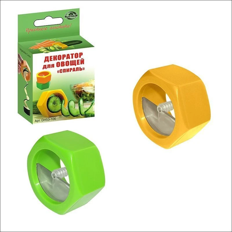 Декоратор для овощей работает по принципу точилки для карандаша. Оригинальная форма в виде гайки, исключает скольжение в руках во время обработки овощей. Для надежной фиксации и оптимального контакта овоща с декоратором, предусмотрен стержень-шуруп, который вкручивается в центр плода одновременно с вращением декоратора, исключая перекос при нарезке. Подходит для нарезки спиралью овощей (диаметром до 5 см), таких как цуккини, кабачки, огурцы, вареной моркови и свеклы и т.п.