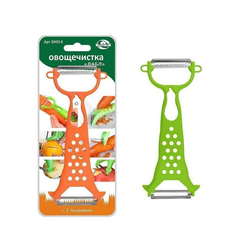Овощечистка "ДАБЛ" станет Вашим незаменимым помощником на кухне. С помощью этой овощечистки вы сможете не только очистить овощи и фрукты от кожуры, а также нарезать тонкой соломкой овощи и протереть мягкие фрукты в пюре. После использования просто промойте овощечистку в проточной воде, можно с использованием жидких моющих средств. Изготовлено из пластмассы (ABS) и коррозионностойкой (нержавеющей) стали.