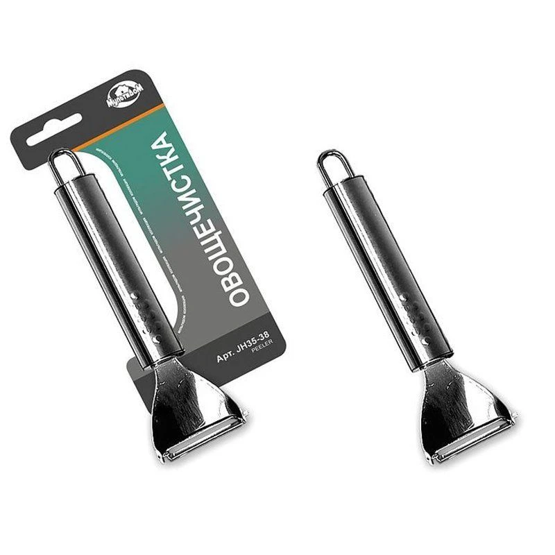 Овощечистка — приспособление, с помощью которого так просто очистить кожицу с овощей, фруктов, корнеплодов. Инструмент имеет удобную рабочую часть и ручку, изготовлено из нержавеющей стали. Для удобства хранения на крючке на ручке есть специальная петля. После использования рекомендуется промыть щеткой с моющими средствами.