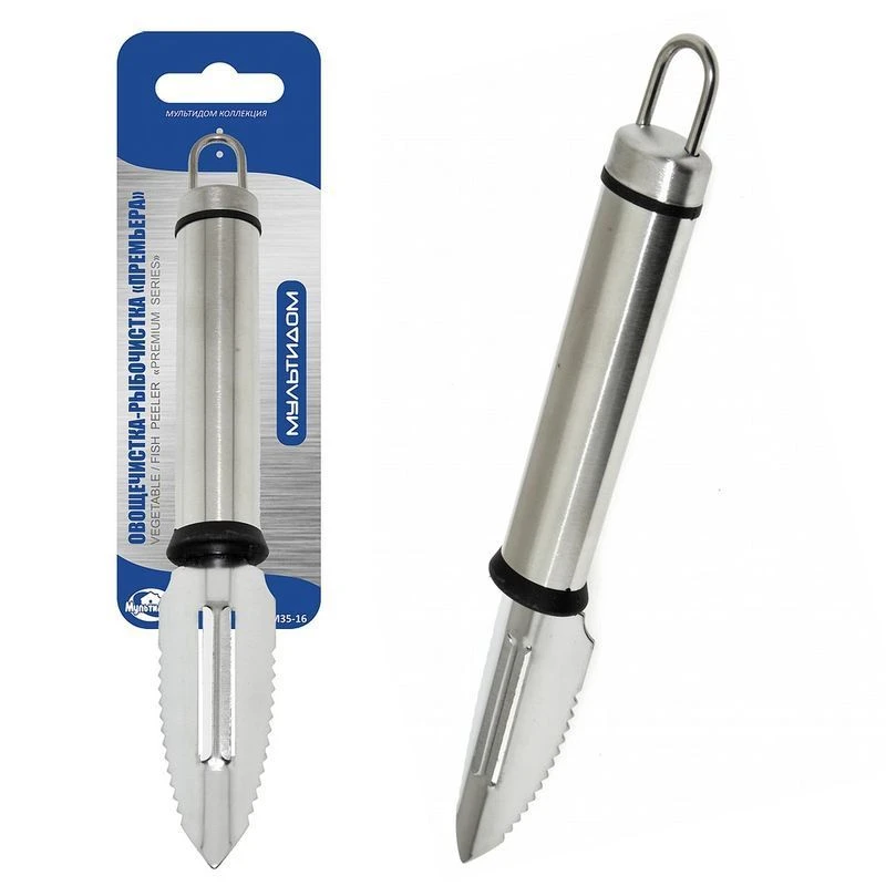 Используется для очистки овощей, фруктов и рыбы. Изготовлена из коррозионностойкой (нержавеющей) стали. После применения вымыть с использованием жидких моющих средств.