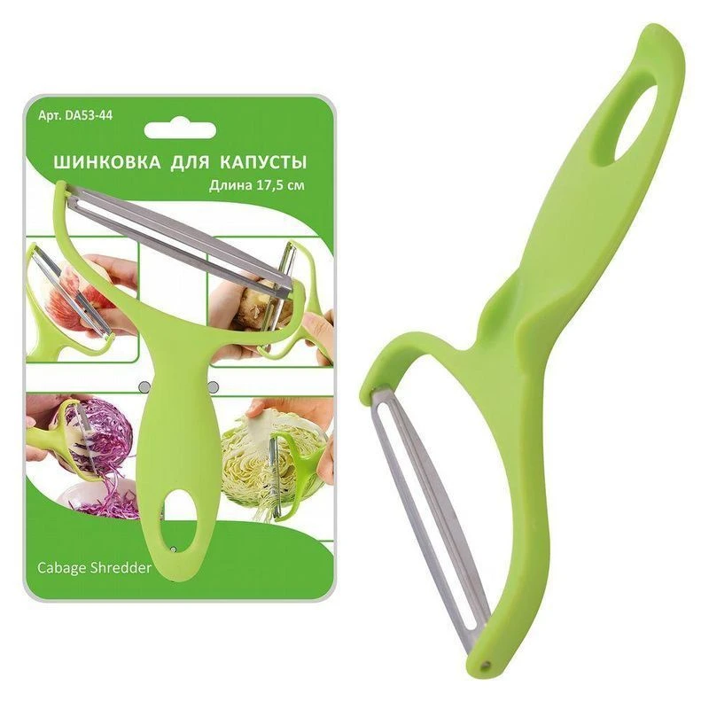 С ручной шинковкой для капусты вы быстро нарежете кочан и очистите овощи. Длинное лезвие позволяет с комфортом обрабатывать большие объемы капусты. Устройство полностью безопасно и удобно в применении. Держите одной рукой капусту или другой овощ, а второй начинайте резать или счищать кожуру. Среди преимуществ: удобство использования, простота ухода, удобная ручка, острые лезвия. Приспособление моется проточной водой, можно использовать моющие средства. Лезвие изготовлено из коррзионностойкой стали, корпус выполнен из пластмассы (полипропилена).