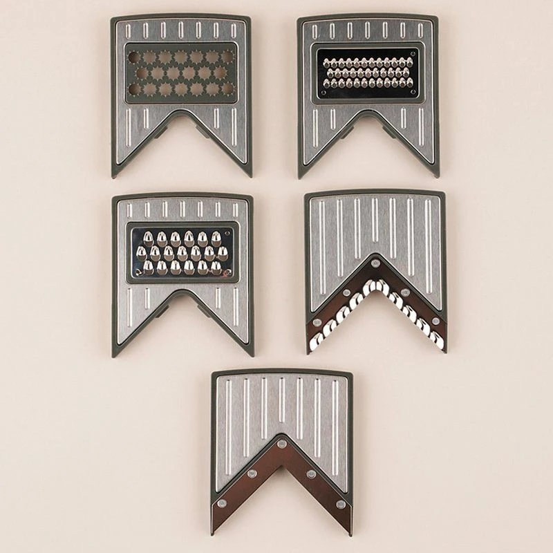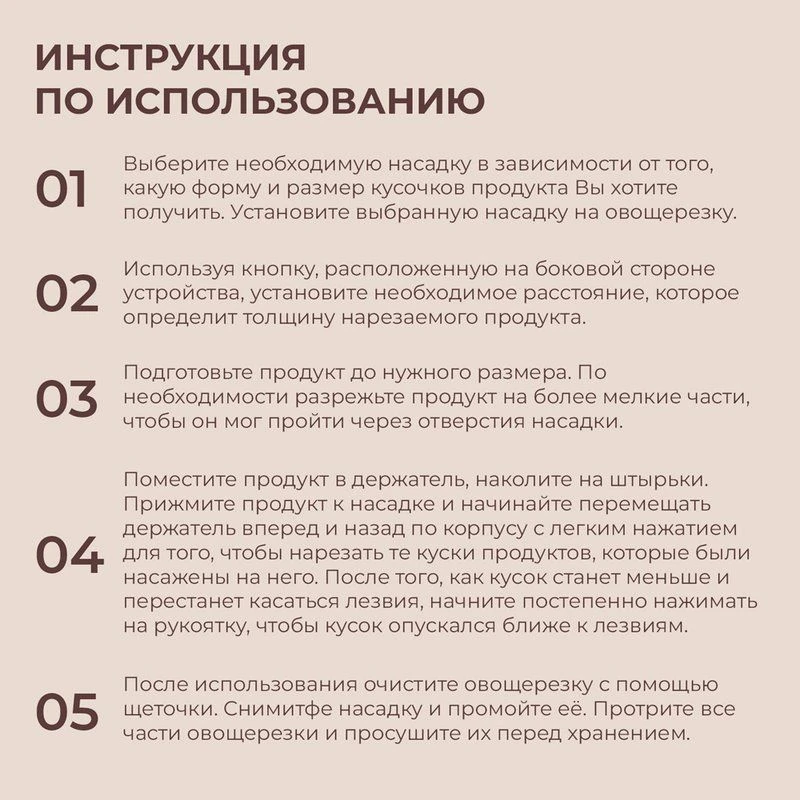 Эта овощерезка изготовлена из высококачественных материалов: лезвия из нержавеющей стали гарантируют долговечность и точность нарезки, а прочный АБС-пластик ручки обеспечивает комфорт и надежность в работе. В наборе вы найдете 5 сменных насадок, каждая из которых предназначена для определенного типа нарезки — от тончайших ломтиков до крупных кусочков, что позволит вам с легкостью создавать кулинарные шедевры.