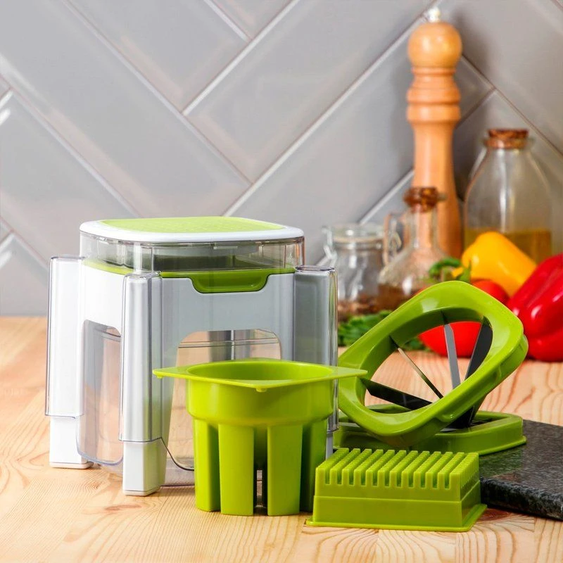 Вместительный контейнер: позволяет нарезать овощи, фрукты и сыр сразу в контейнер без использования дополнительной посуды и беспорядка на столе. Нарезайте сразу большое количество продуктов, используя удобный контейнер. Больше не нужно прерываться на перекладывание.