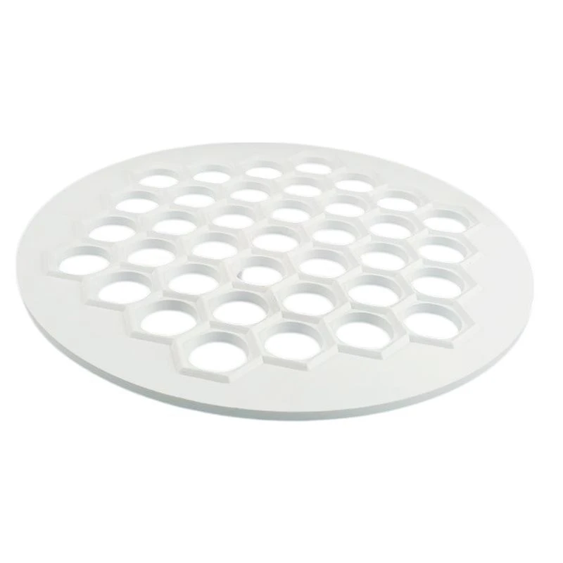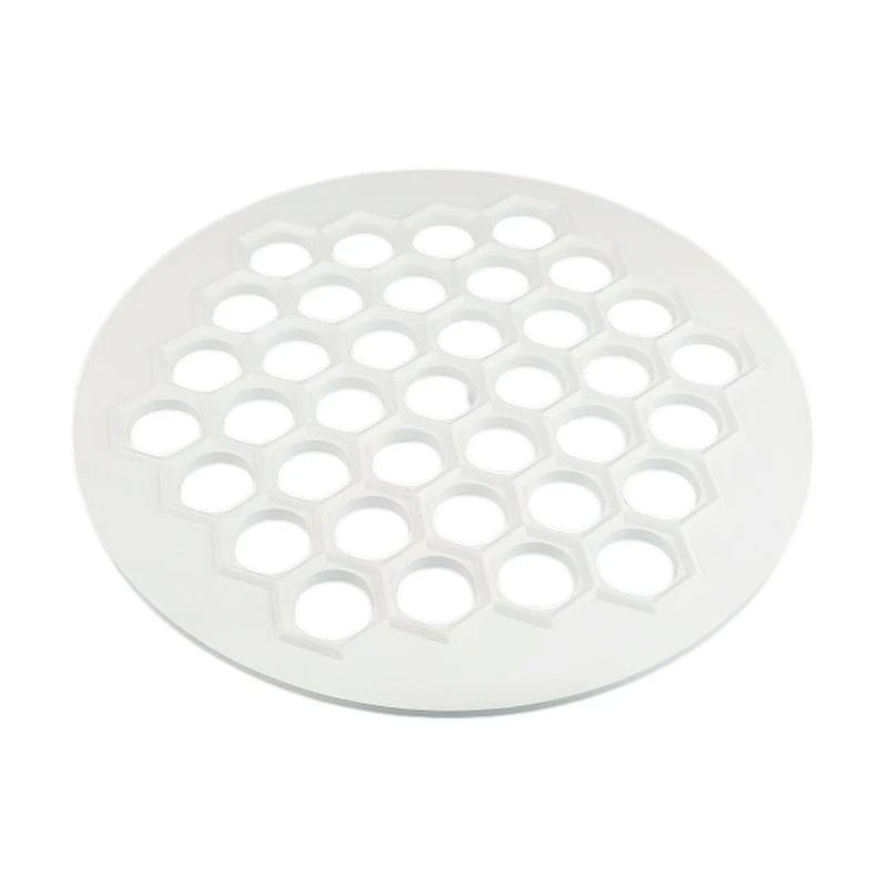 Форма для лепки представляет собой круглый пластиковый кулинарный молд круг диаметром 27см с ячейками диаметром 3см на небольших ножках. На выходе получаем 37 пельмешек с любым вкусным соусом. Способ приготовления блюда: хорошо присыпать форму мукой, раскатать скалкой два одинаковых пласта тугого пельменного теста, чуть больше заготовки, выложить один лист теста на формочку. Ложкой накладываем мясной куриный любой фарш с приправами специями соль зелень ягоды творог в каждую выемку, накрываем вторым пластом, прокатываем скалкой.
