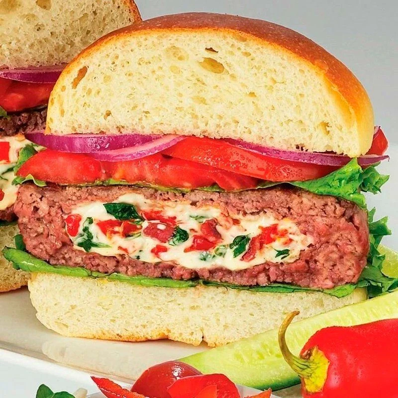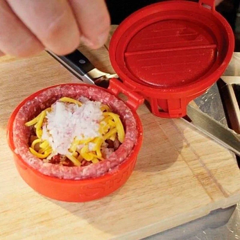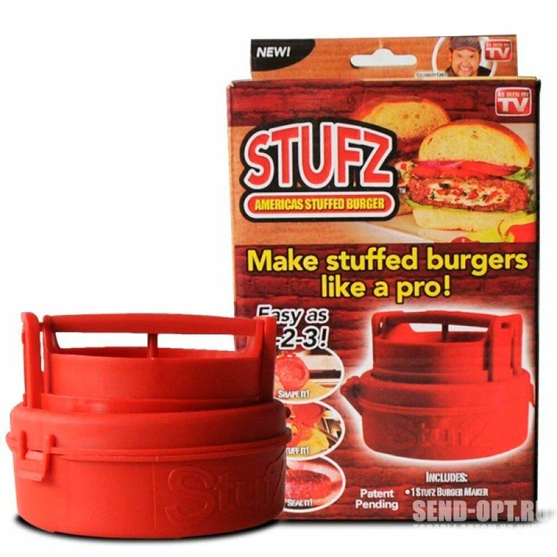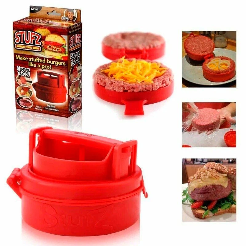 Пресс-форма для создания котлет с начинкой для гамбургеров StufZ burger maker. Красный пластик — твердый без запаха, из него аккуратно отлиты все надписи и отдельные части StufZ burger. Размеры: высота — 4,5 см, диаметр — 11 см