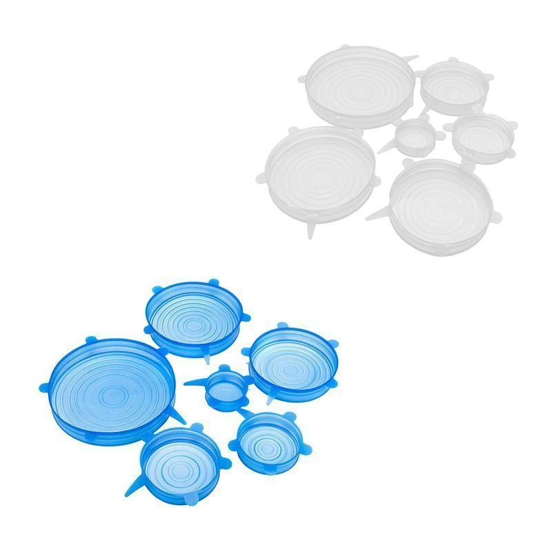 Износостойкие силиконовые крышки обеспечивают герметичность для посуды любых форм и размеров. Набор из 6 штук подходит для хранения от небольших порций до объемных емкостей