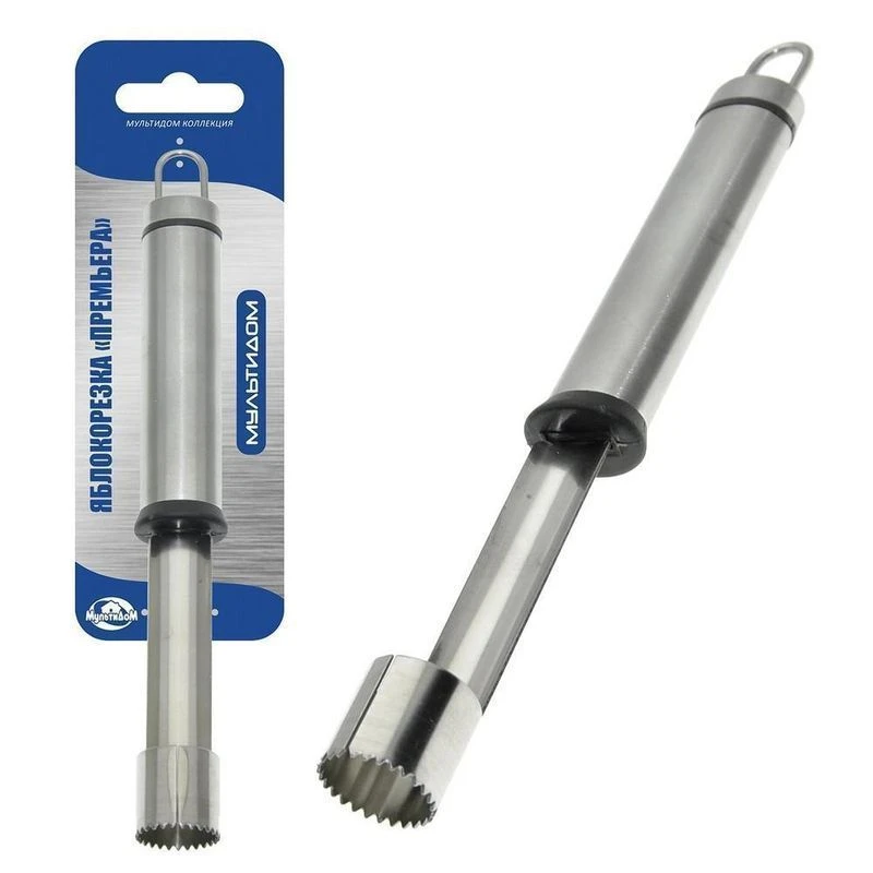 Удаление сердцевины яблок — сложное занятие, которое требует особой усидчивости, особенно, если речь идет о больших объемах переработки этого фрукта. Очистить яблоки для приготовления компотов, варенья или просто для приема пищи вам поможет яблокорезка «Премьера». Инструмент работает по принципу пробойника: нужно проткнуть яблоко по центру и достать нож вместе с сердцевиной. Преимущество в том, что стенки в центре фрукта остаются ровными и он не разваливается. Очень удобное приспособление для приготовления фруктов для детей. Изделие изготовлено из коррозионностойкой (нержавеющей) стали. После использования промойте с жидкими моющими средствами.