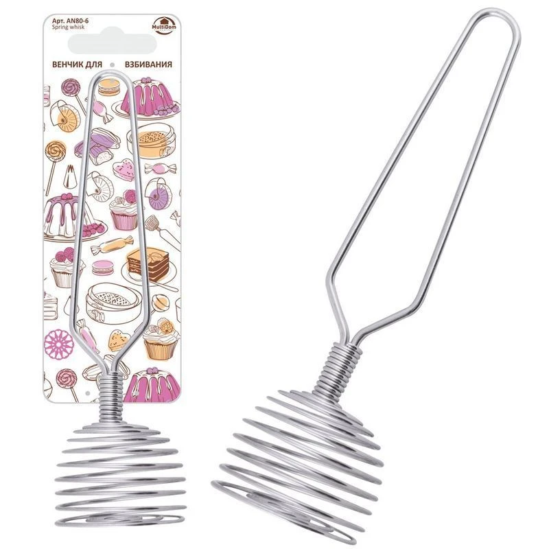 Венчик в виде спирали удобен для небольших емкостей, аккуратно взбивает содержимое и не разбрызгивает его. Для взбивания металлическим венчиком лучше всего использовать пластмассовую, стеклянную или металлическую тару без защитного покрытия.