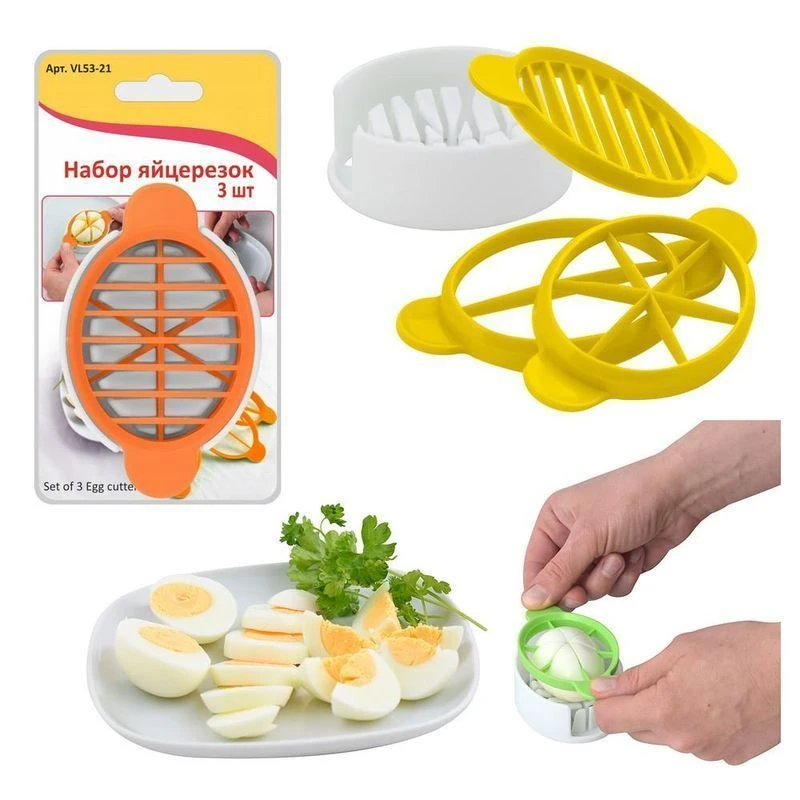 С помощью этой яйцерезки Вы сможете нарезать яйцо быстро и аккуратно: пололам, на дольки или ломтики. Проста в использовании. Просто разместите яйцо на подставке и разрежьте выбранной Вами насадкой. Просто, как -раз, -два, -три! Пригодится также для разрезания мягких фруктов и овощей небольшого размера. После использования промойте яйцерезки под проточной водой, можно с использованием жидких моющих средств. Изготовлено из пластмассы (ABS).