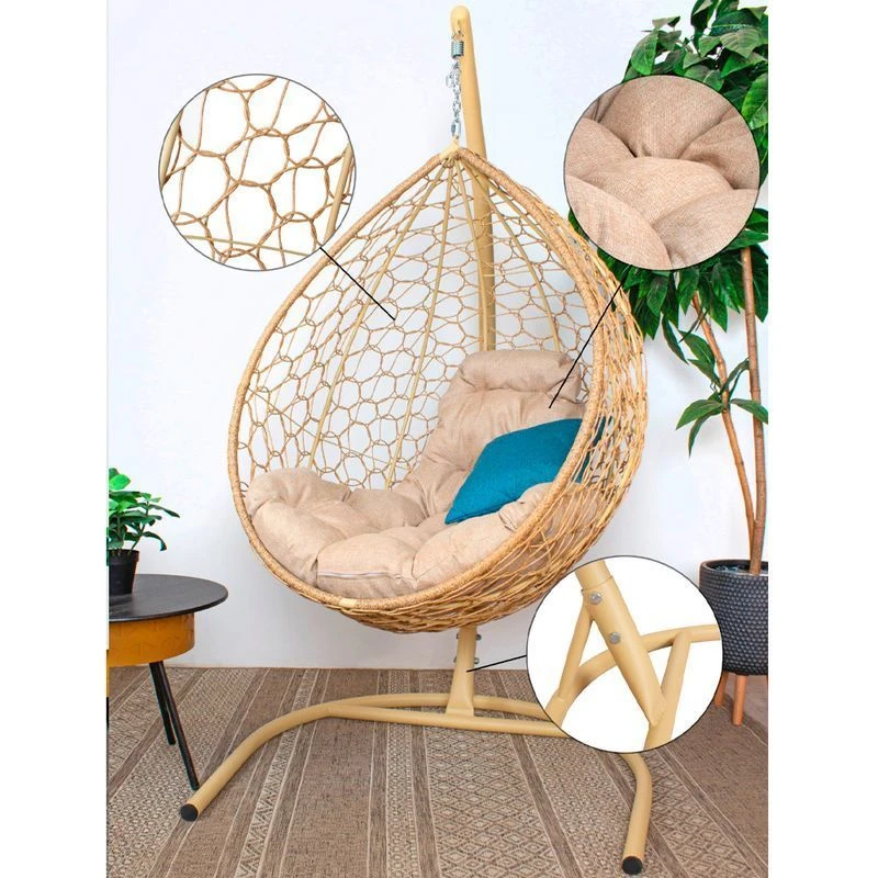 Стальной корпус качелей выдерживает нагрузку до 120 кг. Надежные сварные и болтовые соединения. Подушка изготовлена из водоотталкивающей ткани Оксфорд 600 с наполнителем. Мягкое тканевое сиденье из гипоаллергенного материала обеспечивает комфортный отдых.