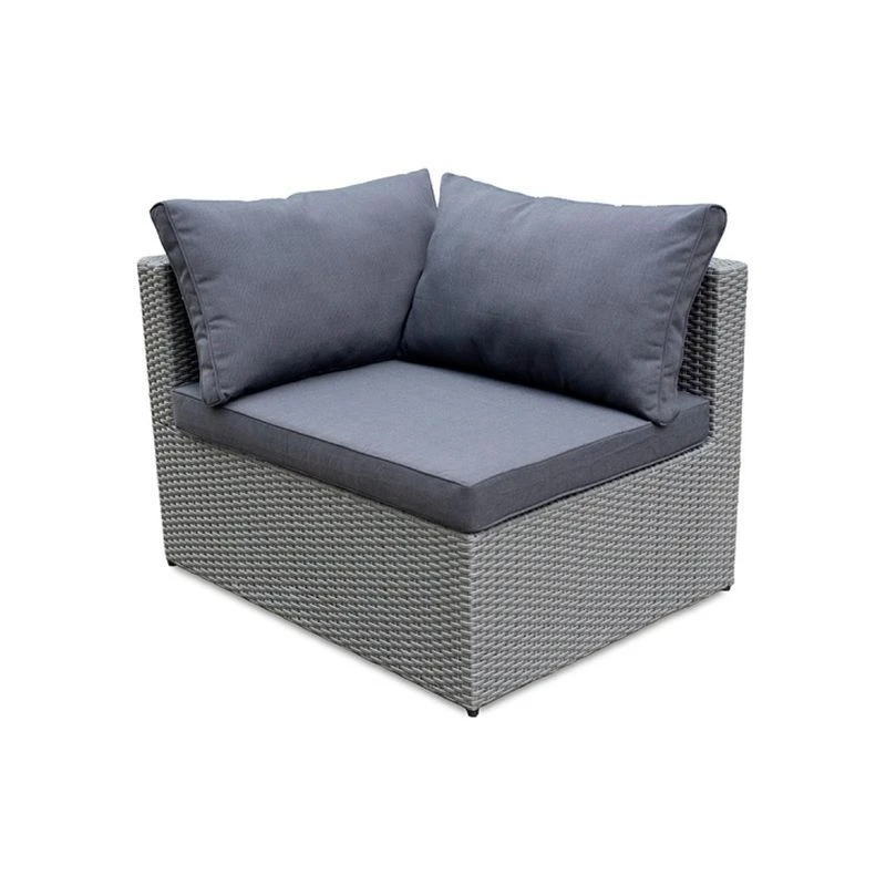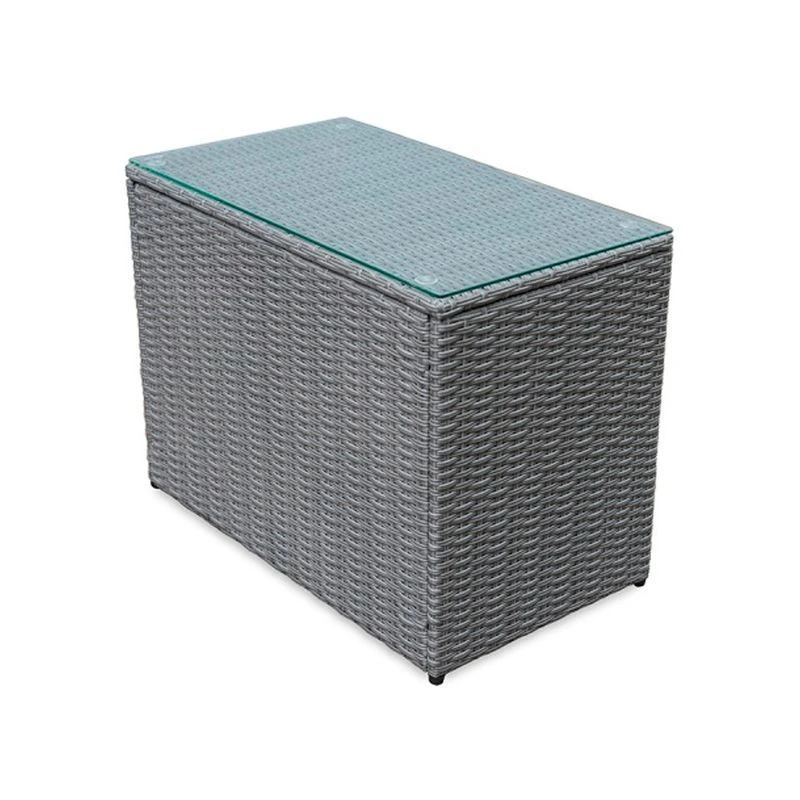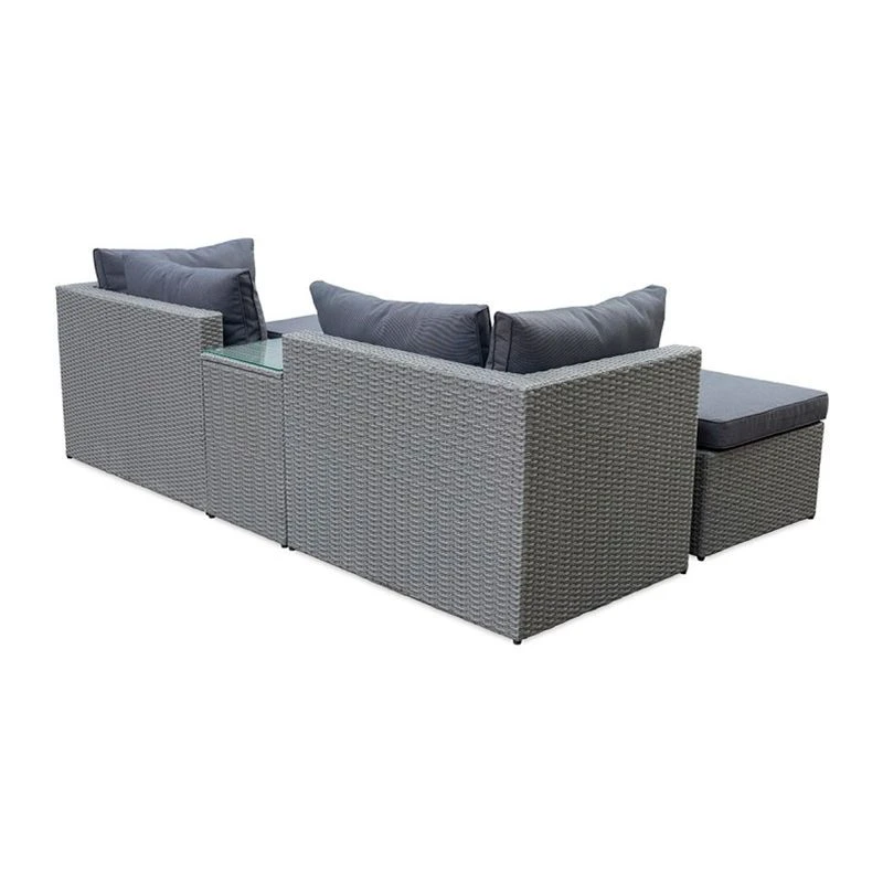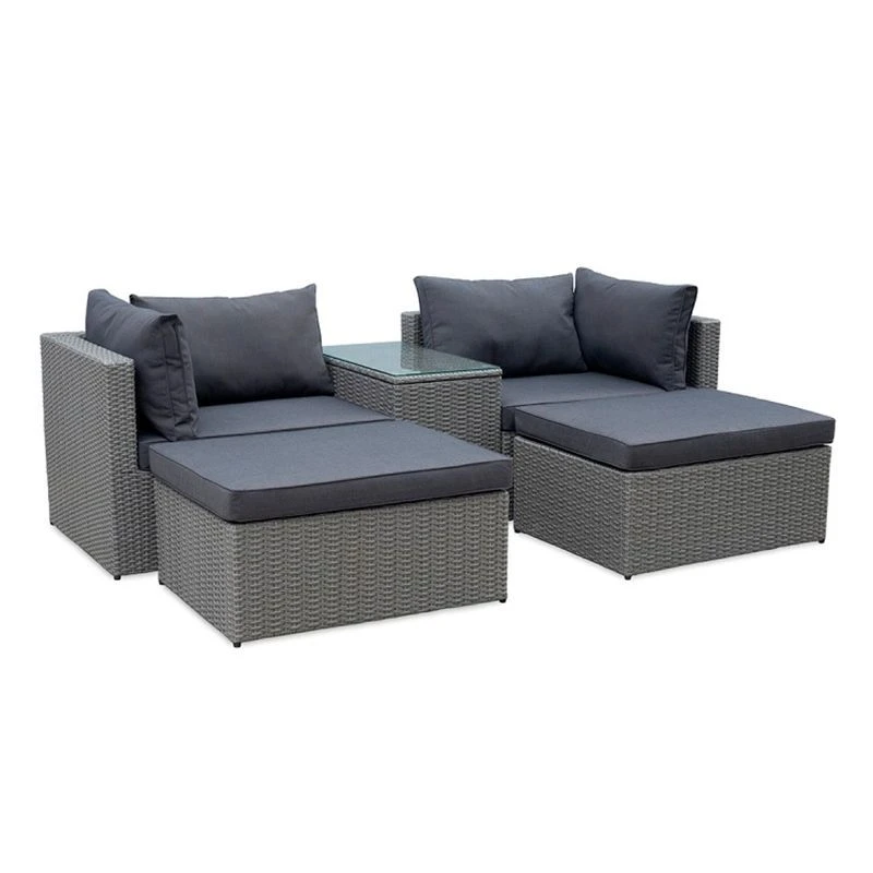 Стильный комплект для отдыха обеспечит своим пользователям наивысший уровень удобства. Комплект отличается современным дизайном, напоминающим натуральное ротанговое переплетение. Надежная конструкция и продуманный дизайн гарнитура обеспечивают устойчивость и оптимальный комфорт. Удобный комплект для большой компании, для сада и террасы. Комплект модульной мебели для сада состоит из двух угловых кресел, двух пуфов и кофейного стола. Размеры элементов комплекта (ШхГ-ДхВ): Кресла – 88x70x76 см, Пуфы – 80x60x40 см, Кофейный стол 70x40x52 см, столешница – прозрачное закаленное стекло. Характеристики: цвет каркаса: серо-коричневый. Материал каркаса: сталь. Цвет чехла мягкого элемента-матраса: серый. Материал чехла мягкого элемента: водоотталкивающая ткань. Толщина мягкого элемента: 7 см Цвет поверхности: серо-коричневый.