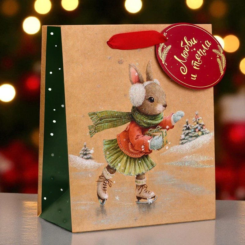 Пакет выполнен из качественных материалов, которые обеспечивают его прочность и долговечность. Он имеет яркий дизайн с новогодними мотивами.