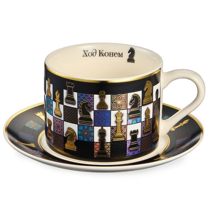 Чайная пара ХОД КОНЕМ с изображением шахмат — это сочетание эстетики, интеллекта и азарта. На элегантной кружке изображён шахматный конь, совершающий свой знаменитый ход, символизирующий неожиданные повороты, стратегию и изящную игру. Такая пара идеально подойдёт для ценителей шахмат, любителей интеллектуальных игр и тех, кто предпочитает наслаждаться чаем с дозой стиля и ума.