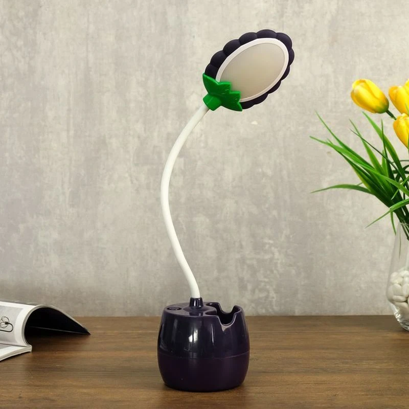 Светодиодная настольная лампа создана для освещения рабочей поверхности стола. В основании есть стакан для ручек. Изделие устанавливается стационарно, гибкая ножка регулирует направление света.