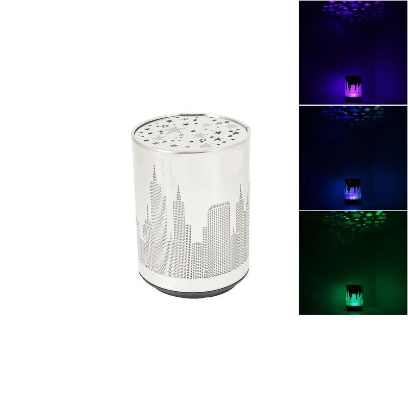 По своей форме ночник напоминает бочонок. По всему его периметру выгравированы небоскрёбы – с сотнями квадратиков окон, пиками на крышах. Сверху же ночник украшают яркие звёзды и кружки.