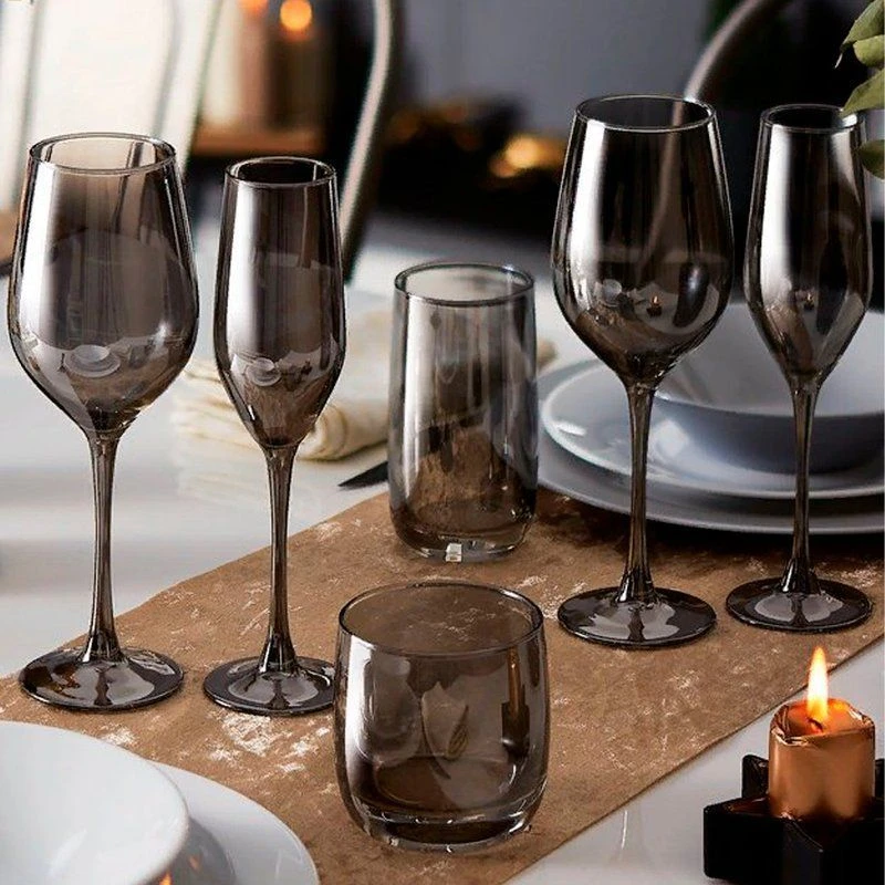 Современные бокалы Люминарк из закаленного стекла подходят для красного и белого вина. Серебристо-графитовый тон меняется, в зависимости от освещения — от зеркального блеска до матовой дымчатости. Отлично сочетается с посудой черных, белых и серо-голубых цветов. Форма бокалов Селест сопоставима с элитными образцами барной посуды и отличается изысканностью и изяществом.