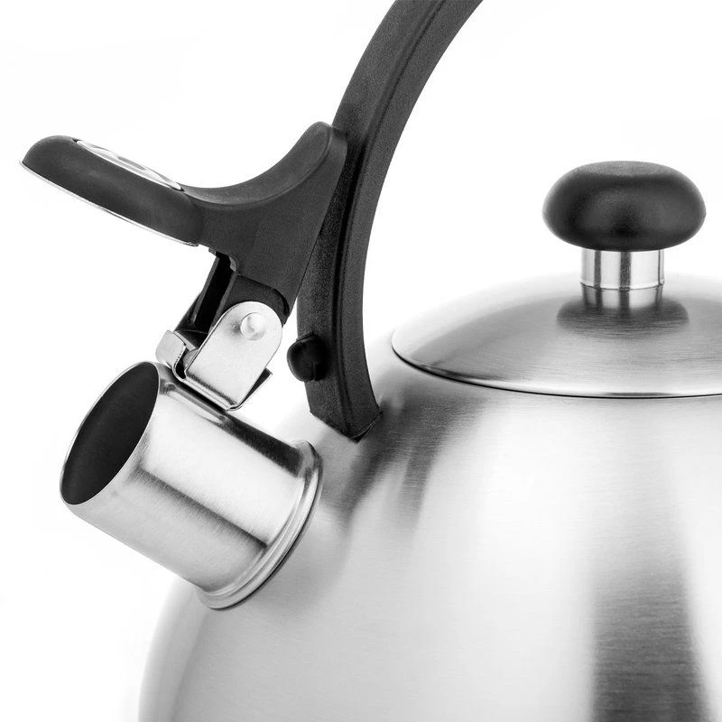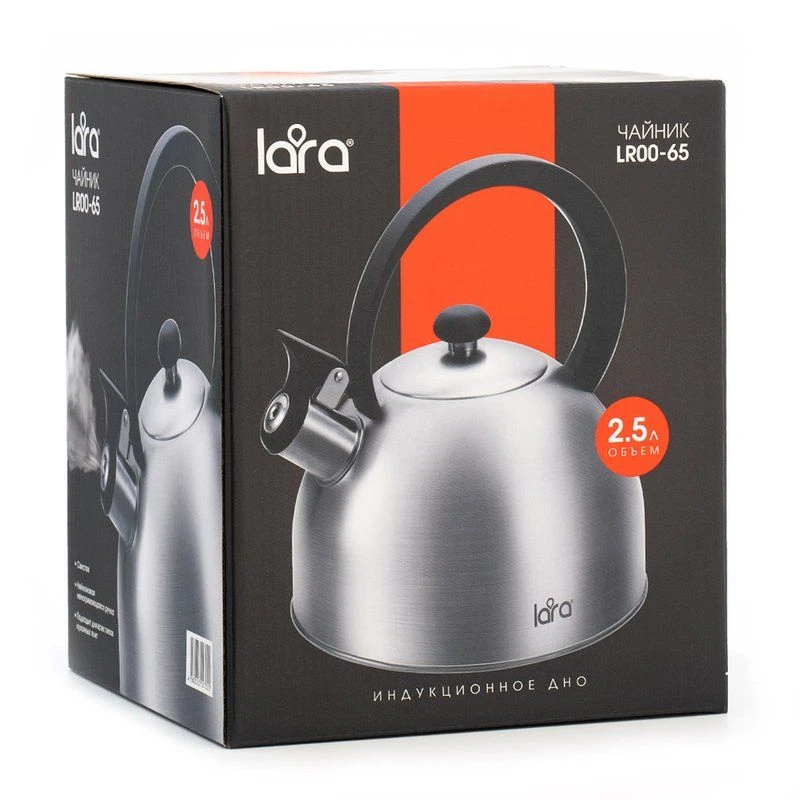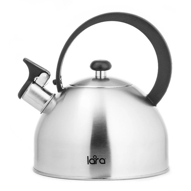 Чайник LARA в классическом корпусе со свистком и элегантной ручкой станет отличным помощником на вашей кухне. Утилитарный дизайн хорошо впишется в любой интерьер. Установленный свисток не позволит пропустить момент закипания воды, и вы вовремя снимите чайник с плиты. Удобная широкая горловина для залива воды. Для корпуса чайника и круглой крышки мы выбрали экологичную высококачественную нержавеющую сталь с матовой полировкой внутри и снаружи. Для ручек использовали ненагревающися нейлон черного цвета. Стальное индукционное дно подойдет для всех типов кухонных плит. Свисток на носике легко и безопасно открывается с помощью установленного рычага.