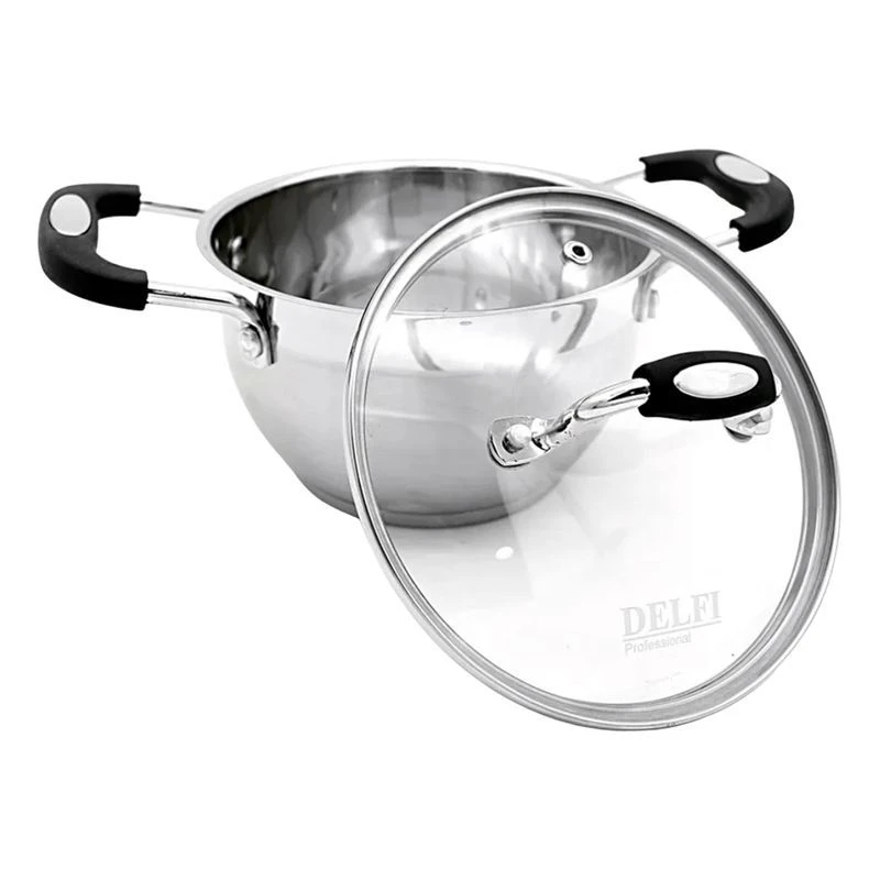 Delfi Кастрюля с крышкой из нержавеющей стали марки 18-10. Трехслойное дно. Ручки прорезиненные. Подходит для всех видов плит, для индукционных включительно.