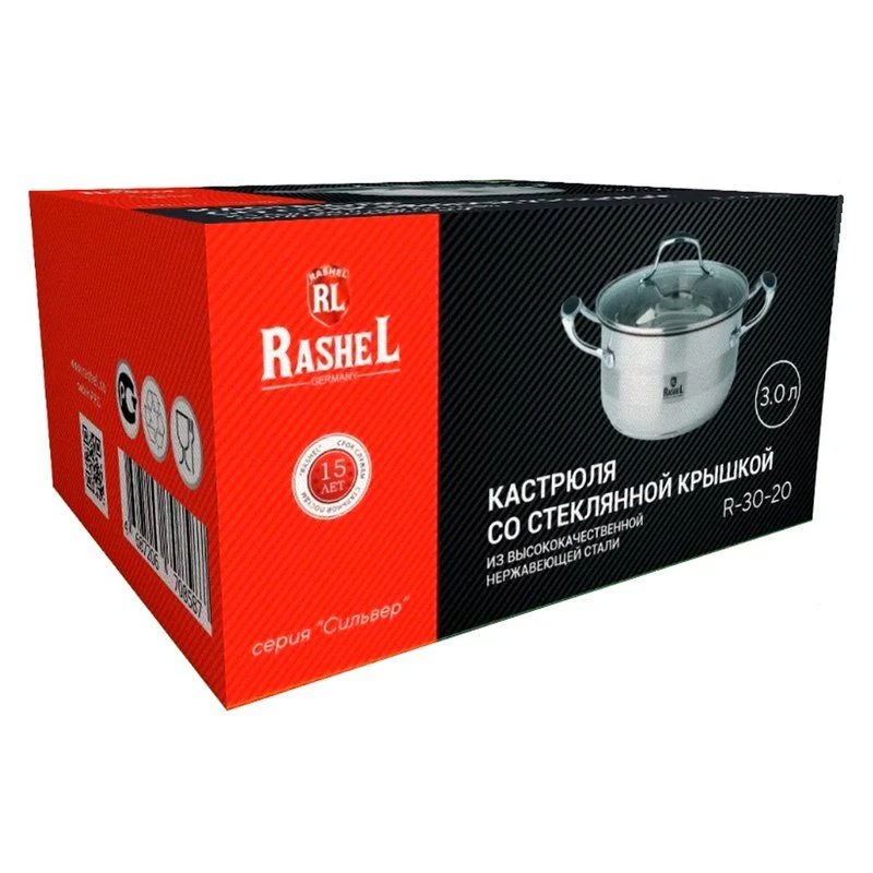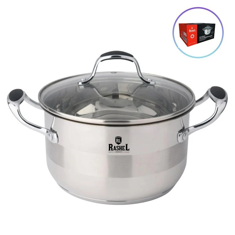 Кастрюли торговой марки RASHEL выполнены из высококачественной нержавеющей стали. Кастрюли удобны в использовании, за ними легко и просто ухаживать. Многослойное капсульное дно равномерно распределяет тепло и долгое время сохраняет достигнутую температуру, тем самым обеспечивает равномерный нагрев и равномерную подачу тепла во внутрь кастрюли.