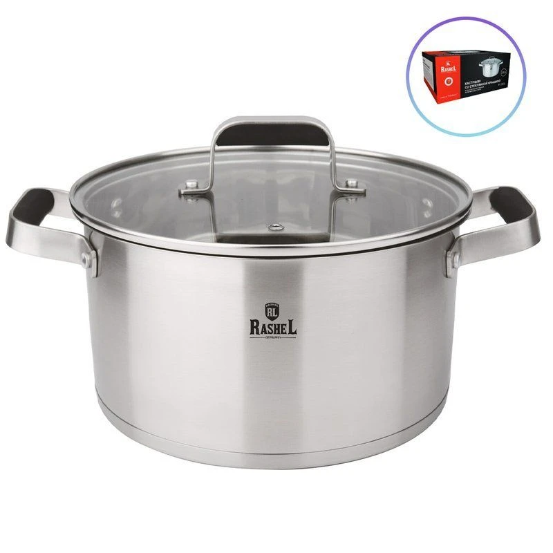 Кастрюли торговой марки RASHEL выполнены из высококачественной нержавеющей стали. Кастрюли удобны в использовании, за ними легко и просто ухаживать. Многослойное капсульное дно равномерно распределяет тепло и долгое время сохраняет достигнутую температуру, тем самым обеспечивает равномерный нагрев и равномерную подачу тепла во внутрь кастрюли.