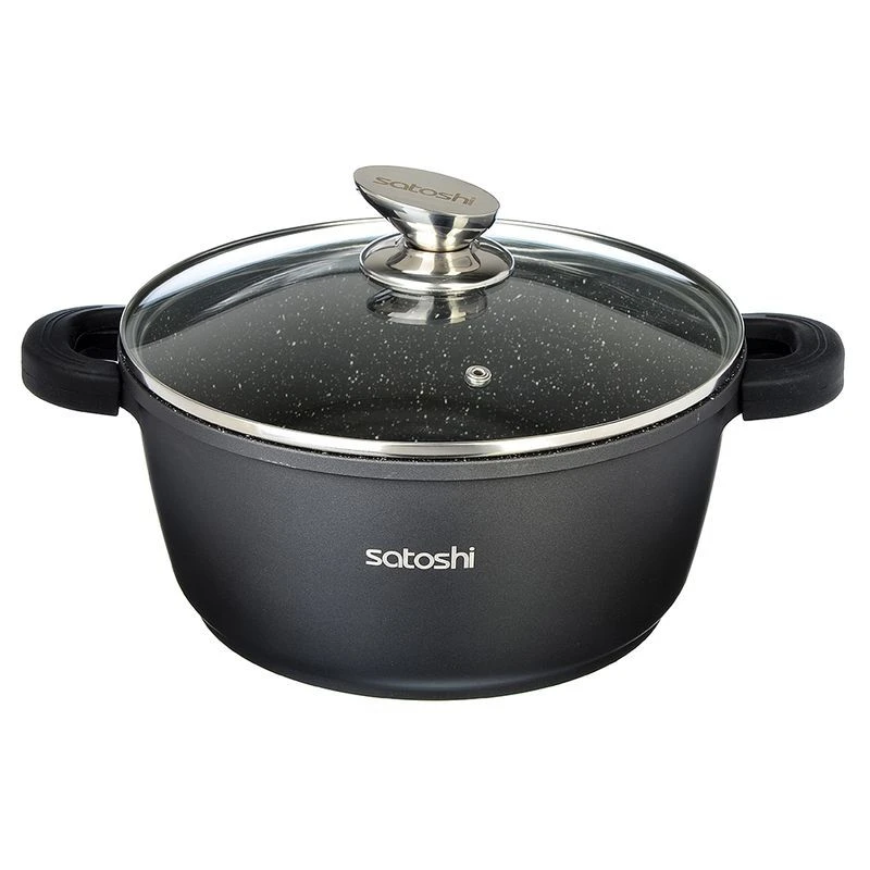 Кастрюля диаметром 26 см из литого алюминия с2-х слойным антипригарным покрытием Мрамор изнутри и краской черного цвета снаружи, с силиконовыми накладками на ручки, подходит для всех типов плит, включая индукцию.