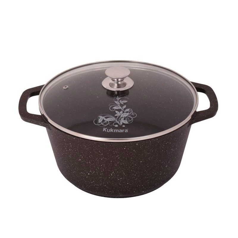 Кастрюля "Kukmara" изготовлена из литого алюминия и покрыта инновационным антипригарным мраморным покрытием нового поколения на водной основе, усиленным сверхтвердыми частицами минералов.