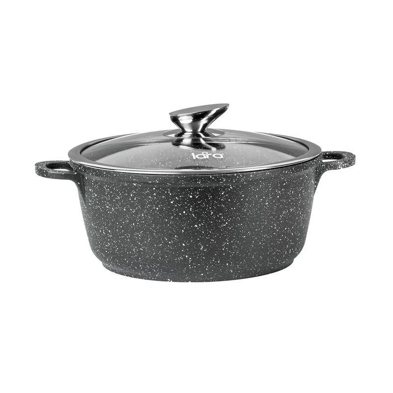 Кастрюля выполнена из литого алюминия и обладает прекрасными теплопроводными свойствами. Прочное антипригарное покрытие с минеральными частицами надежно защищает дно и стенки от повреждений. Крышка с паровыпуском изготовлена из жаропрочного стекла, имеет стальной обод и удобную ручку G-формы. Индукционное дно подходит для всех типов плит.