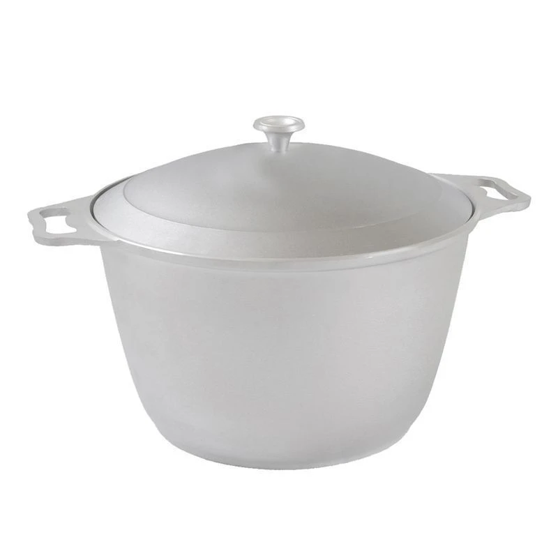 Кастрюля изготавливается из пищевых алюминиевых сплавов методом кокильного литья. Это самый качественный и экологически чистый способ изготовления литой толстостенной посуды. При приготовлении пищи в литой посуде создается эффект "русской печи"; еда в ней "томится", а не жарится, придавая пище особый вкус. Такая посуда удобна для жарки мяса, запекания индейки или курицы, тушения овощей.
