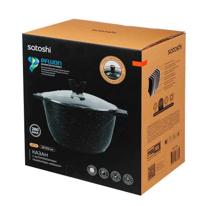 Казан SATOSHI Монфор размером 22*12,5 см и объемом 3,7 л из литого алюминия со стеклянной крышкой с пароотводом – это качественная долговечная посуда для приготовления блюд методом тушения и длительного томления. Высокопрочное безопасное антипригарное покрытие PFLUON под «мрамор» на водной основе без PFOA рассчитано на интенсивное использование и выдерживает длительный нагрев до 280 градусов. Оптимальная толщина стенок обеспечивает быстрый нагрев и равномерное приготовление. Ручка на крышке с покрытием софт-тач с держателем может использоваться как подставка для столовых приборов. Казан можно использовать в духовке без крышки. Подходит для всех типов плит, включая индукцию.