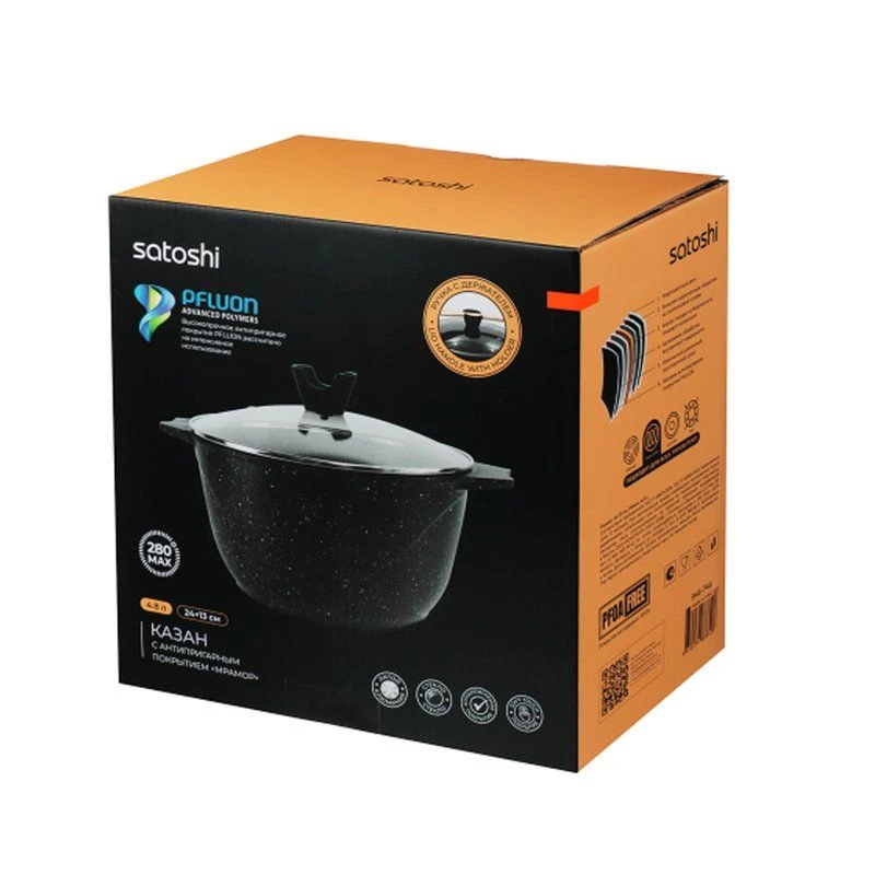 Казан SATOSHI Монфор размером 24*13 см и объемом 4,8 л из литого алюминия со стеклянной крышкой с пароотводом – это качественная долговечная посуда для приготовления блюд методом тушения и длительного томления. Высокопрочное безопасное антипригарное покрытие PFLUON под «мрамор» на водной основе без PFOA рассчитано на интенсивное использование и выдерживает длительный нагрев до 280 градусов. Оптимальная толщина стенок обеспечивает быстрый нагрев и равномерное приготовление. Ручка на крышке с покрытием soft-touch с держателем может использоваться как подставка для столовых приборов. Казан можно использовать в духовке без крышки. Подходит для всех типов плит, включая индукцию.