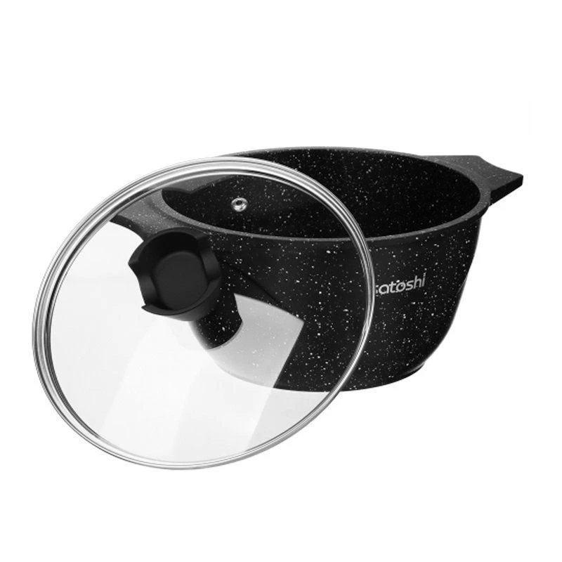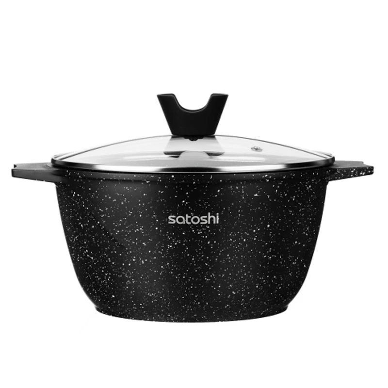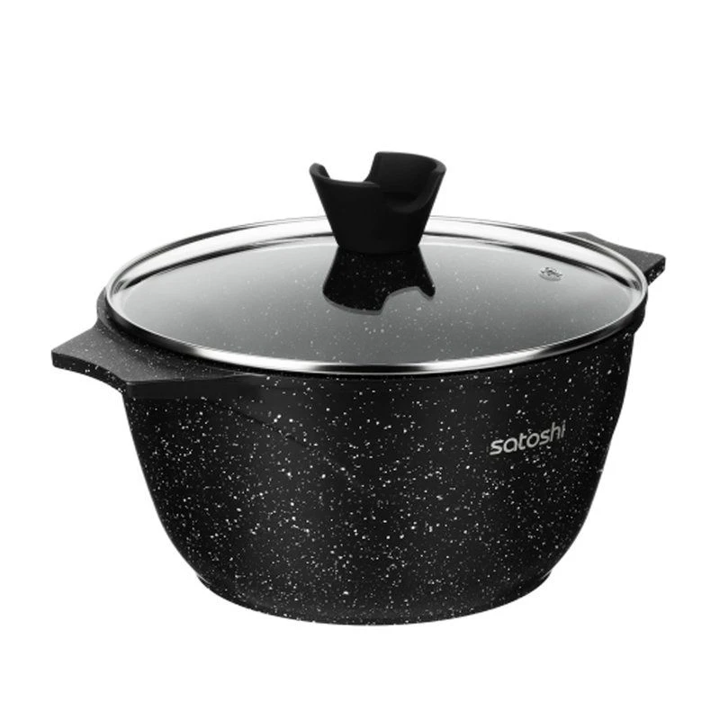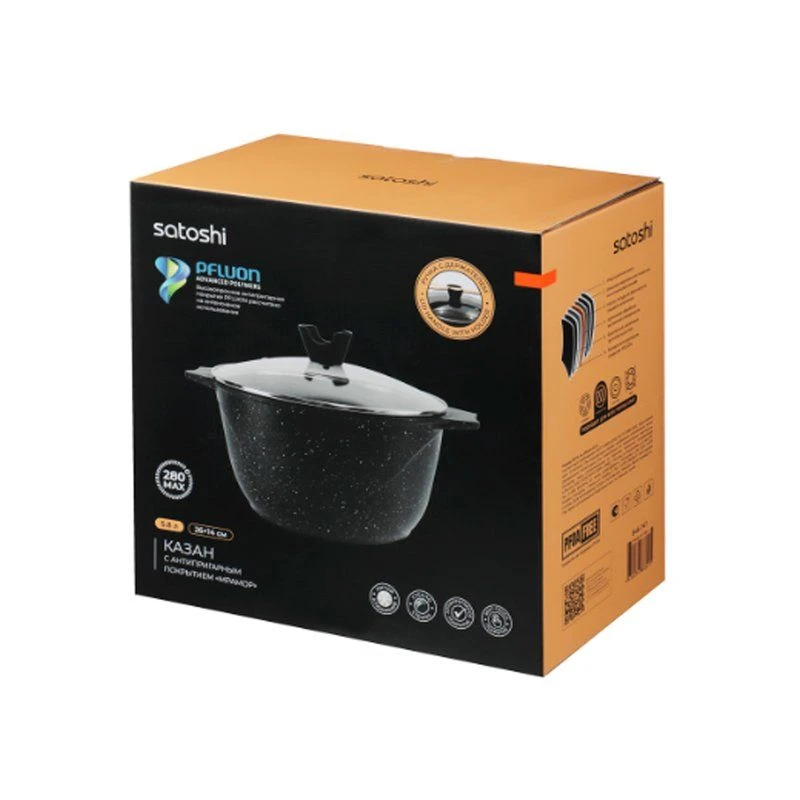 Казан SATOSHI Монфор размером 26*14 см и объемом 5,8 л из литого алюминия со стеклянной крышкой с пароотводом – это качественная долговечная посуда для приготовления блюд методом тушения и длительного томления. Высокопрочное безопасное антипригарное покрытие PFLUON под «мрамор» на водной основе без PFOA рассчитано на интенсивное использование и выдерживает длительный нагрев до 280 градусов. Оптимальная толщина стенок обеспечивает быстрый нагрев и равномерное приготовление. Ручка на крышке с покрытием soft-touch с держателем может использоваться как подставка для столовых приборов. Казан можно использовать в духовке без крышки. Подходит для всех типов плит, включая индукцию.