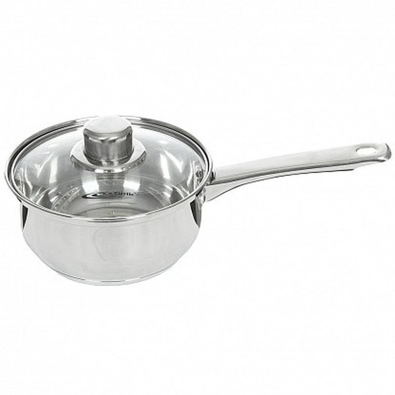 Ковш 1,6 л серии Гретта изготовлен из высококачественной нержавеющей стали. Крышка из термостойкого закаленного стекла снабжена металлическим ободком для прочности и более плотного закрывания, а также пароотводом. Металлическая ручка ковша прикреплена к корпусу методом клепочной фиксации, что обеспечивает минимальный нагрев, прочность и надежность. Форма ковша грушевидная, наружная полировка зеркальная. Возможна чистка в посудомоечной машине.