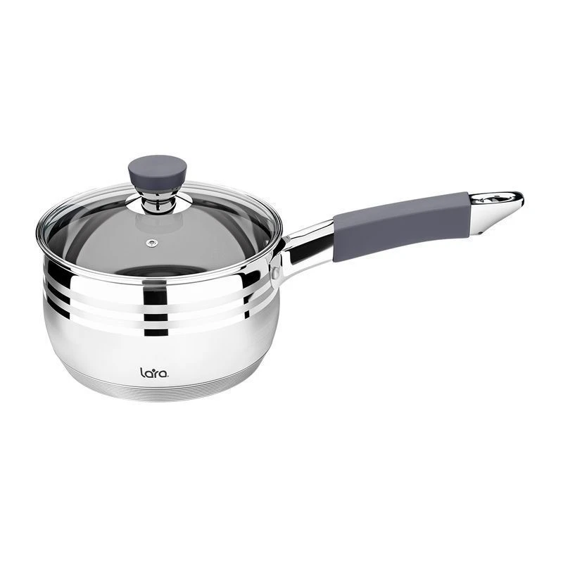 Округлый дизайн, зеркальная полировка корпуса с тремя матовыми полосами придают изделию безупречный внешний вид и делают его стильным элементом интерьера. Внутренняя мерная шкала для соблюдения рецептуры. Корпус выполнен из высокоуглеродистой нержавеющей стали. Крышка с паровыпуском изготовлена из жаропрочного стекла и имеет стальной обод С-формы, который плотно прилегает к стенкам сотейника. Надежная длинная ручка на прочных заклепках с накладкой из силикона. Девятиступенчатое индукционное капсулированное дно подойдет для всех типов плит.
