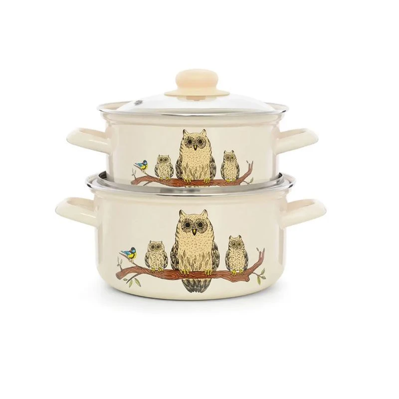 Набор посуды изготовлен из высококачественного стального проката и покрыт стеклокерамической эмалью. Внутри и снаружи - трехслойное глянцевое эмалированное покрытие. Эмалевое покрытие, являясь стекольной массой, не вызывает аллергию и надежно защищает пищу от контакта с металлом. Кроме того, такое покрытие долговечно, оно устойчиво к механическому воздействию, не царапается, а стальная основа практически не подвержена механической деформации, благодаря чему срок эксплуатации увеличивается. Крышка с эмалированным покрытием оснащена удобной ручкой. Она плотно прилегает к краю, сохраняя аромат блюд. Подходит для всех типов плит, включая индукционные. Можно мыть в посудомоечной машине.