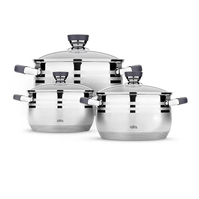 Набор посуды серии «Mercury» – это кастрюли классической формы в современном прочтении. Мы совместили матовую и зеркальную полировку стали, чтобы посуда выглядела безупречно. Внутренняя мерная шкала облегчает процесс приготовления и позволяет точно следовать выбранной рецептуре. Корпус выполнен из высокоуглеродистой нержавеющей стали AISI201. Крышка с разборной ручкой и паровыпуском изготовлена из жаропрочного стекла. Стальной обод C-формы плотно прилегает к стенкам. Термоупорный силикон на ручке и крышке кастрюли защитит от ожогов. Девятиступенчатое индукционное капсулированное дно подойдет для всех типов плит. Мы защитили кастрюлю, крышку, а также силиконовые накладки от механических повреждений, бережно упаковав элементы изделия в защитную пленку. Готовьте с удовольствием в посуде LARA серии «Mercury».