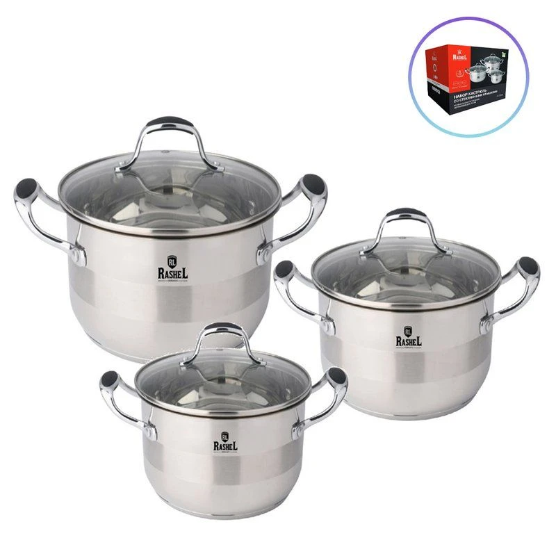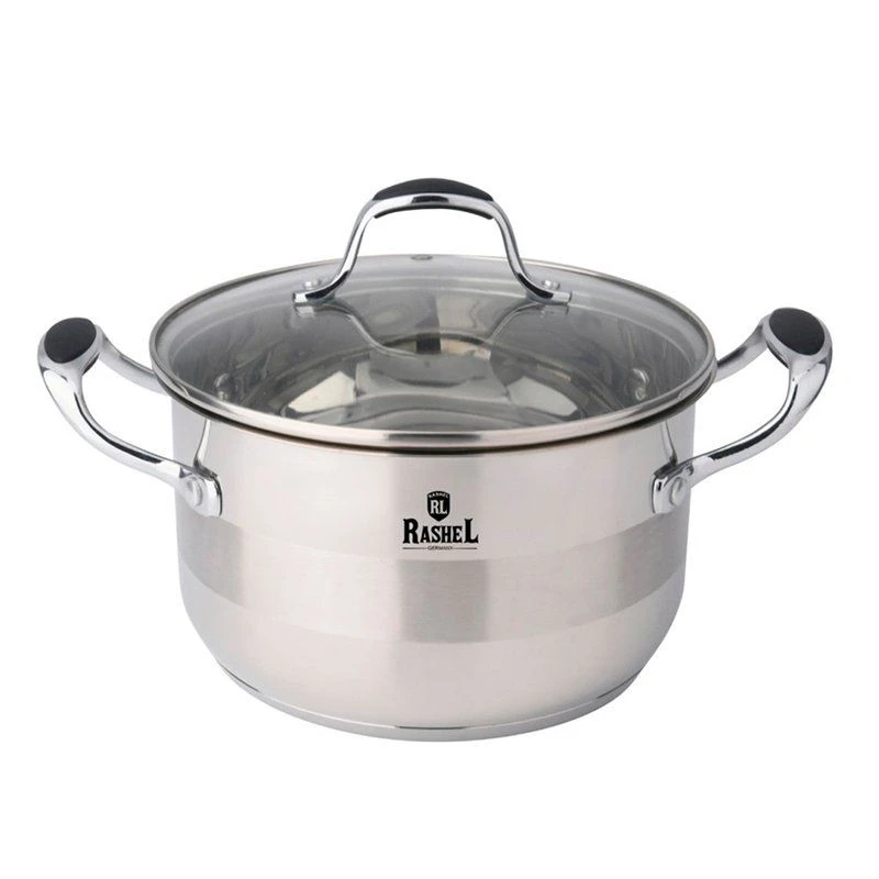 Кастрюли торговой марки RASHEL выполнены из высококачественной нержавеющей стали. Кастрюли удобны в использовании, за ними легко и просто ухаживать. Многослойное капсульное дно равномерно распределяет тепло и долгое время сохраняет достигнутую температуру, тем самым обеспечивает равномерный нагрев и равномерную подачу тепла во внутрь кастрюли.