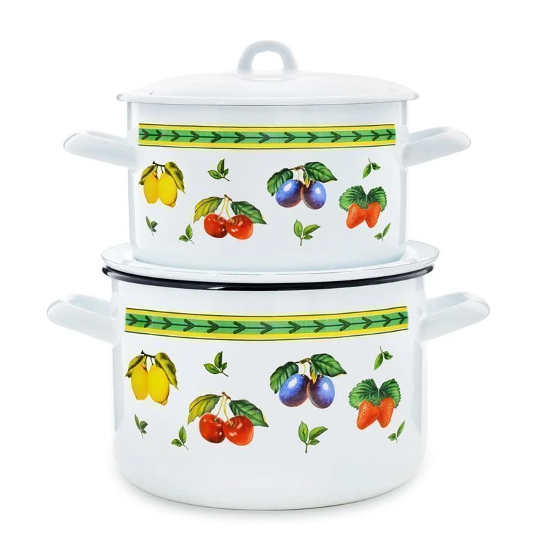 Набор посуды изготовлен из высококачественного стального проката и покрыт стеклокерамической эмалью. Внутри и снаружи - трехслойное глянцевое эмалированное покрытие. Эмалевое покрытие, являясь стекольной массой, не вызывает аллергию и надежно защищает пищу от контакта с металлом. Кроме того, такое покрытие долговечно, оно устойчиво к механическому воздействию, не царапается, а стальная основа практически не подвержена механической деформации, благодаря чему срок эксплуатации увеличивается. Крышка с эмалированным покрытием оснащена удобной ручкой. Она плотно прилегает к краю, сохраняя аромат блюд. Подходит для всех типов плит, включая индукционные. Можно мыть в посудомоечной машине.Толщина стенок 0,8 мм