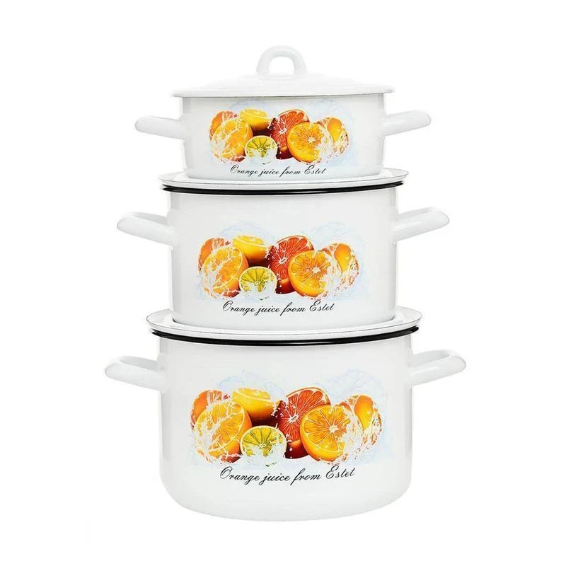 Набор посуды изготовлен из высококачественного стального проката и покрыт стеклокерамической эмалью. Внутри и снаружи трехслойное глянцевое эмалированное покрытие. Эмалевое покрытие, являясь стекольной массой, не вызывает аллергию и надежно защищает пищу от контакта с металлом. Кроме того, такое покрытие долговечно, оно устойчиво к механическому воздействию, не царапается, а стальная основа практически не подвержена механической деформации, благодаря чему срок эксплуатации увеличивается. Крышка с эмалированным покрытием оснащена удобной ручкой. Она плотно прилегает к краю, сохраняя аромат блюд. Подходит для всех типов плит, включая индукционные. Можно мыть в посудомоечной машине.Толщина стенок 0,8 мм