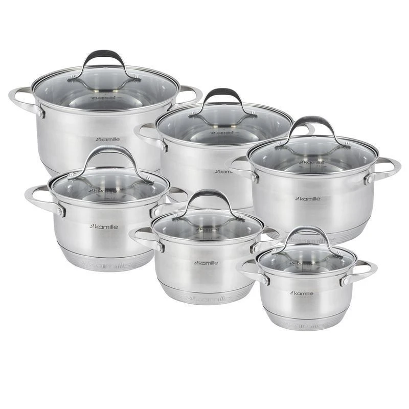 Материал: нержавеющая сталь. Материал крышки: жаропрочное стекло. Комплектация: кастрюля 1,8 л. (O16х10,5 см); кастрюля 2,3 л. (O18х11,5 см) - 2 шт; кастрюля 3,3 л. (O20х12,5 см) - 2 шт; кастрюля 5,8 л. (O24х14,5 см). Тип дна: 7-ми слойное. Мерная шкала: есть. Способ крепления ручек: клепочное соединение. Крышка с отверстием для выхода пара: да. Полировка металла: зеркальная-сатин. Тип плиты: электрическая, стеклокерамическая, индукционная, газовая. Подходит для мытья в посудомоечной машине.