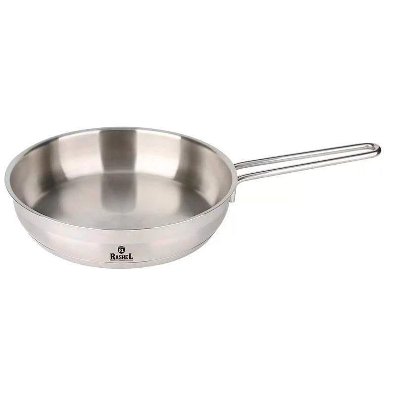 Сковороды торговой марки "RASHEL" выполнены из высококачественной нержавеющей стали. Сковороды удобны в использовании, за ними легко и просто ухаживать. Сковороды оснащены удобной ручкой из нержавеющей стали. Способ крепления ручки: клепочный. Многослойное капсульное дно равномерно распределяет тепло и долгое время сохраняет достигнутую температуру, тем самым обеспечивает равномерный нагрев и равномерную подачу тепла во внутрь сковороды. Пища не пригорает благодаря равномерному распределению тепла по нижней части и стенкам, продукты с высоким содержанием влаги можно подвергать кулинарной обработке без воды и самое главное исключено образование канцерогенных веществ, так как для жарки можно не использовать растительное масло.