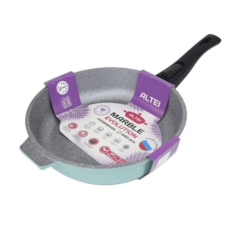 Marble Evolution – литая толстостенная посуда с антипригарным покрытием нового поколения, усиленным сверхпрочными частицами мрамора и других минералов. Прочное и долговечное покрытие, равносильна по стойкости природному камню, разработана специально для использования на каждый день. Основание – литой корпус толщиной 4,5 – 6 мм. Метод нанесения АП покрытия – напыление.