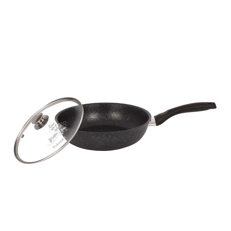 Сковорода "Kukmara" изготовлена из литого алюминия и покрыта инновационным антипригарным мраморным покрытием нового поколения на водной основе, усиленным сверхтвердыми частицами минералов.